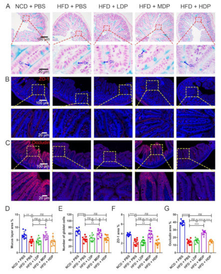 A recent study has shown that intestinal barrier dysfunction could cause bacteria and endotoxins to enter the human body, leading to increased susceptibility to inflammatory diseases in the body, which in turn lead to the onset of atherosclerosis [27]. Intestinal barrier function is regulated by the mucus layer and tight junctions of the intestine [28]. Therefore, the effect of DP on the mucin layer area and expression levels of the major tight junction proteins in the intestine was explored. The mucus and goblet cells in the ileum were assessed by the Alcian blue binding assay (Figure 6A). The area of the mucus layer treated with MDP increased significantly compared with that in the HFD + PBS group (Figure 6D). Consistent with the mucus layer area result, the number of mucus-secreting goblet cells appeared to increase (Figure 6E). In addition, the expression levels of the tight junction proteins, including ZO-1 and occludin, were significantly reduced in the HFD + PBS group but upregulated in the MDP + PBS group. (Figure 6B,C,F,G). However, LDP and HDP had no significant effect on the expression of ZO-1 and occludin.