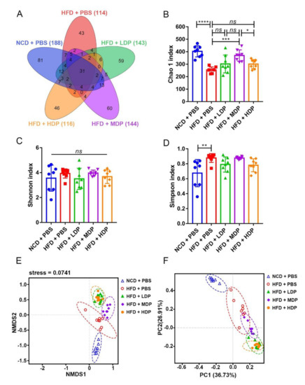 Cecal content diversity analysis after oral gavage with dual-protein (DP) nutrition. ApoE−/− mice were grouped and treated as in Figure 1. (A) Unique and shared intestinal operational taxonomic units (OTUs) of each group are shown in the Venn diagram. (B–D) Alpha diversity (Chao1 index, Shannon index, Simpson index); beta diversity indicated by nonmetric distance scaling (NMDS) (E) of weighted UniFrac distance and principal coordinates analysis (PCoA) plot (F). Data are presented as mean ± SD. n = 8, * p < 0.05, ** p < 0.01, *** p < 0.001, **** p < 0.0001, ns indicates no significance. Phosphate-buffered saline (PBS), normal-chow-diet (NCD), high-fat-diet (HFD), low-dose dual-protein (LDP), middle-dose dual-protein (MDP), high-dose dual-protein (HDP).