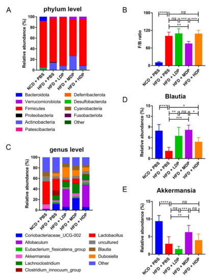 Relative abundance of bacteria at the phylum and family level. ApoE−/− mice were grouped and treated as in Figure 1. (A) Bacterial taxonomic profiling of intestinal bacteria from different groups at the phylum level. (B) Ratio of Firmicutes to Bacteroidota (F/B) in the five groups. (C) Bacterial taxonomic profiling of intestinal bacteria from different groups at the genus level. (D,E) Relative abundance of Blautia and Akkermansia in the five groups. Data are presented as mean ± SD. n = 8, * p < 0.05, ** p < 0.01, *** p < 0.001, **** p < 0.0001, ns indicates no significance. Phosphate-buffered saline (PBS), normal-chow-diet (NCD), high-fat-diet (HFD), low-dose dual-protein (LDP), middle-dose dual-protein (MDP), high-dose dual-protein (HDP).