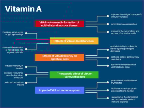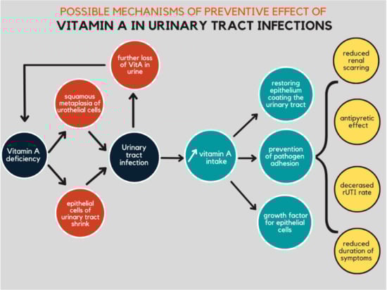Yilmaz et al. investigated the influence of vitamin A supplementation on recurrent urinary tract infection. UTI recurrence rates during the 12-month follow-up significantly decreased after a single dose of vitamin A given when the patients were enrolled in the study. This decrease was notably more prominent during the first six months [86]. The consequences of Vitamin A deficiency on urinary tract and possible effects of VitA supplementation are shown in Figure 5.
