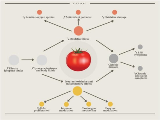 Lycopene appears to reach high levels in the prostate and human semen [48,49]. However, the mechanism itself by which lycopene is accumulated in prostatic tissue and excreted into semen remains unknown. High concentration levels of lycopene in prostatic tissue are linked with the prevention of pathologies, such as BPH. These actions are thought to be mediated through various mechanisms, including the inhibition of 5-alpha-reductase expression [50].