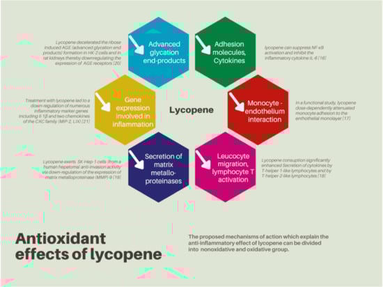The regulation of gap-junction communication in fibroblast cells [10], prevention of beta-carotene 9’,10’-oxygenase suppression [11], regulation of the cell cycle [12], modulation of the liver metabolizing enzyme cytochrome P4502E1 [13], reduction of cellular proliferation induced by insulin-like growth factors [14], enhancement of the total percentage of T-cells, and increased NK-cell activity [15] are proposed nonoxidative mechanisms responsible for the anticarcinogenic effects of lycopene (Figure 3) [16,17,18,19,20,21].