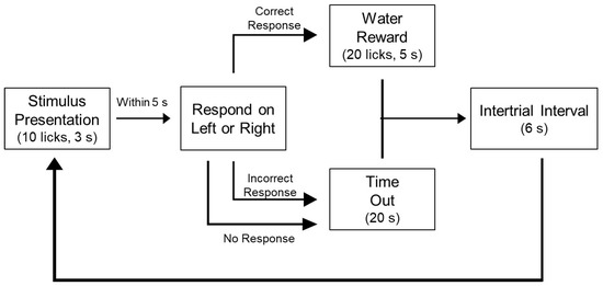 Flowchart of trial parameters. Once a trial had begun, animals had to sample the stimulus and very quickly decide on which side to respond. If they were correct, they received a water reward; if they were incorrect or did not respond, they received a timeout.