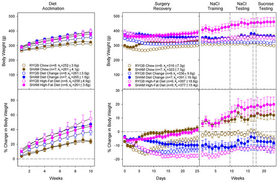 Comparisons of body weight and percent change in body weight were confirmed with ANOVA. During Diet Acclimation, the body weights of each animal on a given Monday were used to determine the group means for that Acclimation Week. Individual body weights during this phase were compared each week to the body weight on the first day animals received acclimation diet. That is, individual body weights from each successive week during the diet acclimation period was compared to the individual weights on the first day of diet acclimation to determine percentage change. Changes in body weights for the duration of the experiment were assessed using the ad libitum body weight of individual animals before water deprivation for each week of testing. The percentage change in body weight during testing was calculated as weekly percentage change on a given Sunday (before water deprivation) from the ad lib body weight of an individual animal the day before surgery. Of note, animals in Phase 1 were trained for 10 weeks (10 training body weights), while animals in Phase 2 were trained for 9 weeks (9 body weights). To standardize statistical comparisons, only body weights from the first 9 weeks of training were used in analyses during the training phase. We do not believe this made a meaningful interpretive impact. Statistically significant group differences in taste pore counts were determined by two-way ANOVAs and paired comparisons where applicable. Due to exceptionally low group sizes in the RYGB HFD group for fat pad measures and hormone tests, this group was excluded from statistical analysis of those measures.