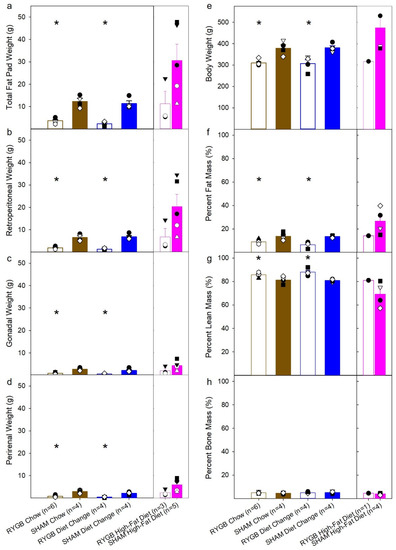Mean (± SE, standard error) and individual animal data for total fat pad weight (a) and weights of the retroperitoneal (b), gonadal (c), and perirenal fat pads (d); the mean (± SE) of the body weight on the day of the EchoMRI scan (e); and the percent fat (f), lean (g), and bone (h) mass from the animals in Phase 2. Diet groups are represented as brown for the Chow group; blue, the diet change; pink, the high-fat diet. RYGB group means within each diet condition are represented by open bars, SHAM by filled bars. Due to low group size, the HFD RYGB group could not be included in the statistical analyses and is represented in a separate panel along with its sham-operated control group, which was included in some analyses. Significant differences from paired comparisons (that survived Bonferroni corrections) between the surgical groups within a diet are represented with “*”.