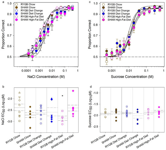 We did find a significant surgery by diet interaction for NaCl EC50 due to a surgery effect in the HFD group (Table 7); however, no significant differences between the groups survived Bonferroni corrections. Moreover, it is important to exercise caution because the effect of diet may be exaggerated by one outlier in the SHAM HFD group. Additionally, it should be highlighted that there are no differences between the three SHAM groups or between the three RYGB groups. The effect of surgery for each diet condition on individual animal performance across concentrations can be observed in Figure 6 (a–c for NaCl threshold testing; d–f for sucrose).