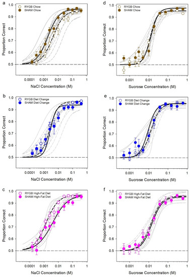 The effect of surgery for each diet condition. Mean (±SE, standard error) proportion correct as a function of stimulus concentration for NaCl (a–c) and sucrose (d–f); Chow groups in the top row, DC in the middle row, and HFD in the bottom row. Solid line on curve fits reflects group averages; the grey lines are for individual data based on the 3-parameter logistic function described in Data Analysis. RYGB animals are represented by open circles and dashed lines and SHAMs by filled circles and solid lines. The horizontal dashed line represents chance performance in this task.
