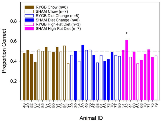 Individual animal performance from the stimulus control test. Filled bars reflect SHAM females and open bars represent the RYGB animals. Brown shading or outlining represent the Chow group; blue, the Diet Change; pink, the High-Fat Diet. One-tailed binomial analyses were used to test for differences greater than chance, represented as significant by “*”. Although the performance of Rat 32 was significantly greater than chance, it was quite poor, and the difference did not survive Bonferroni correction. The horizontal dashed line represents chance performance in this task.
