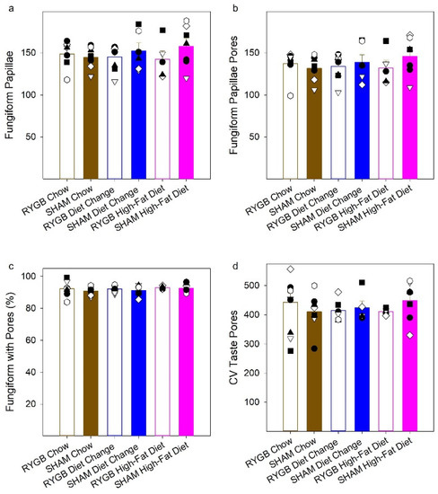 Histological analyses. Mean (± SE) and individual number of fungiform papillae (a), number of taste pores in the anterior tongue (b), percent of fungiform papillae that had a taste pore (c), and number of taste pores in the circumvallate papillae (d). RYGB groups are in open bars, SHAMs, in filled. Diet groups are represented as brown for the Chow group; blue, the diet change; pink, the high-fat diet.