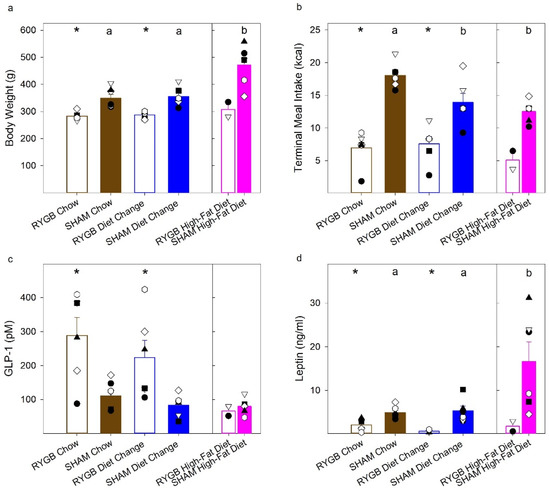 In addition to the behavioral assays, postprandial levels of glucagon-like peptide 1 (GLP-1) and leptin were assessed. GLP-1 is an incretin hormone released from intestinal L-cells and is associated with appetite and satiation [72]. Patients and rodents experience increased postprandial release of GLP-1 following RYGB surgery [21,73], and the level of hormone response, in humans, can predict the success of surgery regarding weight loss [74,75]. Leptin, released from adipose tissues, also has a functional role in regulating food intake and has a known association with obesity [76,77]. As a validation of the RYGB model (GLP-1) and a proxy for body adiposity (leptin), rats were tested for postprandial GLP-1 response and plasma leptin.