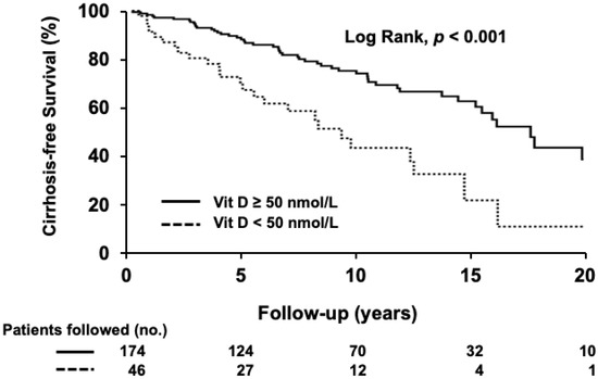 Cirrhosis-free survival in patients with and without vitamin D (VD) deficiency. Survival over time was assessed using Kaplan–Meier curves and the comparison between curves was performed using the log-rank test. Cirrhosis-free survival was shorter in patients with VD deficiency compared to the patients without deficiency (p < 0.001). Number of followed patients at each time-point is shown below the figure.