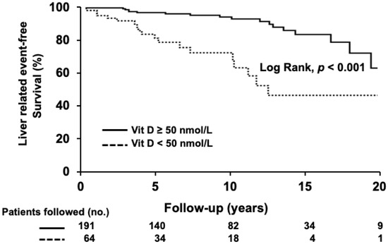 Cirrhosis was present in 35 patients at diagnosis (14%), and among patients without cirrhosis at presentation (n = 220), 80 patients (36%) developed cirrhosis during follow-up. Shorter median time to cirrhosis development was observed in patients with VD deficiency (10 years; 95% CI 7–13) when compared to the patients without deficiency (19 years; 95% CI, 16–21; p < 0.001; log-rank test, Figure 1).