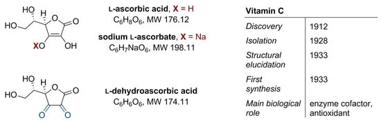 Vitamin C (l-ascorbic acid, Figure 1) is water-soluble. It has a regulatory function in the metabolism of carbohydrates, proteins, and fats, and in the biosynthesis of selected hormones, enzymes, collagen, or iron absorption. It also participates in immunity building and shows antioxidant properties that indirectly protect cells against oxidative stress [1,2]. Vitamin C is exogenous and makes an essential component of the diet; its source is either food or appropriate supplementation. In food products vitamin C may occur in two forms, differing in chemical stability, in vivo half-life, and the transport mechanism [3]: (i) the reduced form–l-ascorbic acid (about 80–90%) and (ii) the oxidized form–l-dehydroascorbic acid (10–20%) (Figure 1) [4]. The recommended daily intake of vitamin C is in the range of 75–90 mg. This amount ensures an optimal plasma concentration of 30–90 µM [2,5].