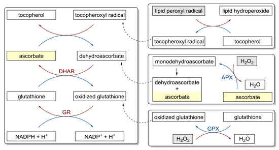 Antioxidant properties of vitamin C and redox cycling antioxidants. APX, ascorbate peroxidase; DHAR, semidehydroascorbate reductase; GPX, glutathione peroxidase; GR, glutathione reductase [86].