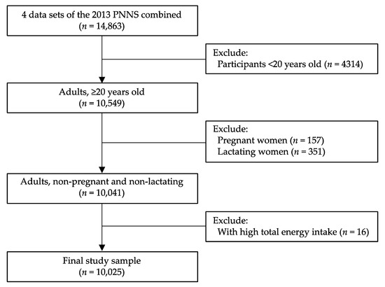 We analyzed data from the Philippine National Nutrition Survey (PNNS) carried out by the Food and Nutrition Research Institute, Department of Science and Technology (FNRI-DOST), in 2013 [28]. The PNNS used a stratified multistage sampling design [29,30]. The study samples were selected from participants aged 20 years or older with complete identification data in the four survey components, i.e., dietary, clinical, socioeconomic individual, and socioeconomic household. Pregnant women and lactating mothers were excluded. Participants with high total energy intake or those with greater than 5 SD of the mean energy intake were further excluded, as applied in past studies [31]. A total of 10,025 adults were eligible for the analysis (Figure 1).