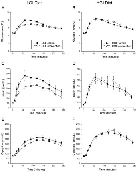 Glucose (A,B), insulin (C,D) and C-peptide (E,F) concentrations during the MTT. The LGI diet is depicted by squares and the HGI diet by circles. The Control diet is denoted by solid symbols and a solid line, and the intervention diet by open symbols and a dashed line. Mean ± SEM.