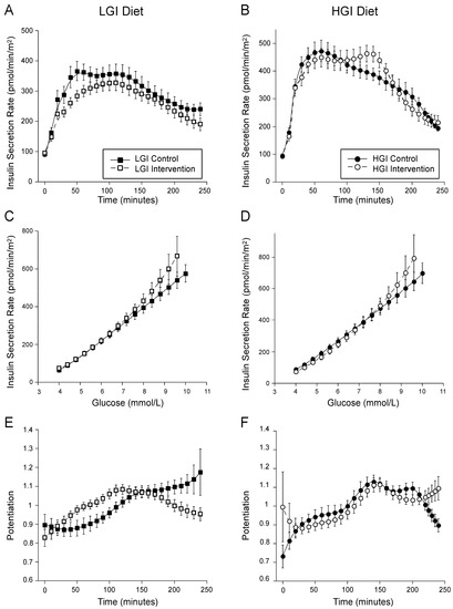ISR vs. time (A,B), ISR vs. glucose dose response (C,D) and potentiation (E,F) from modeling of glucose and C-peptide concentrations during the MTT. The LGI diet is depicted by squares and the HGI diet by circles. The Control diet is denoted by solid symbols and a solid line and the intervention diet by open symbols and a dashed line. Mean ± SEM.