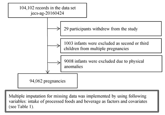 This study was based on the jecs-ag-20160424 dataset, which included 104,102 registered children (fetuses and embryos), and was released to all researchers involved with the JECS in June 2016. In cases of multiple pregnancies, outcomes of the second and third pregnancies were excluded to remove duplicates (n = 1003 (0.96%)). Infants born with physical anomalies were excluded (n = 9008 (8.7%)). Twenty-nine (0.03%) participants withdrew from the study. Finally, data from 94,062 pregnancies were included in the main analysis (Figure 1). The mean (SD) age at registration was 30.7 (5.1) years. The mean (SD) gestational age at registration was 14.4 (5.6) weeks.