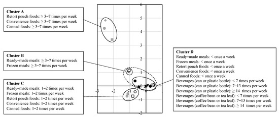 We examined dietary habits in MCA after dividing it into four clusters by HCA (Figure 2). Cluster A included high consumption of retort pouch, convenience, and canned foods. Cluster B included high consumption of ready-made and frozen meals. Cluster C included moderate consumption of ready-made, frozen meals, retort pouch, convenience, and canned foods. Cluster D included low consumption of all kinds of processed foods and all frequency groups of both beverages (in a can or plastic bottle and extracted from coffee bean or tea leaf). Clusters B and C represented the dietary pattern associated with a high risk of stillbirth, specifically moderate to high consumption of ready-made and frozen meals. The increase in the risk of stillbirth rates associated with consumption of ready-made and frozen meals was independent of the impact of beverage consumption in both cluster and covariate-adjusted analyses (Table 2).