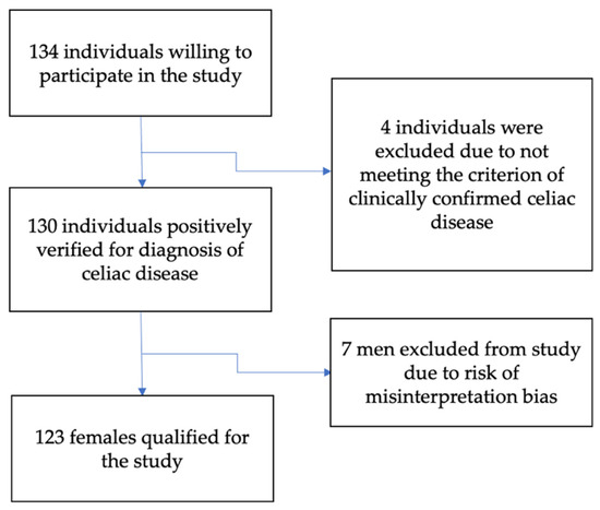 Despite the relatively lengthy recruitment process, a limited number of men participated in the study. Therefore, to avoid bias of inappropriate gender ratio, the study group was eventually restricted to women. Thus, the final study group consisted of 123 females verified for inclusion criteria. A flowchart of the study participants is shown in Figure 1.