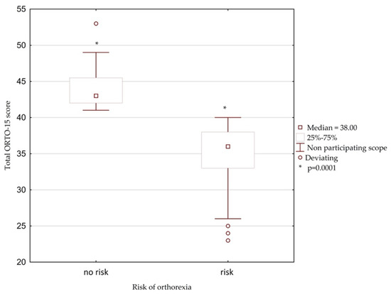 As shown in Figure 2 the total ORTO-15 test score was significantly different between individuals with and without risk for orthorexia (p = 0.0001).