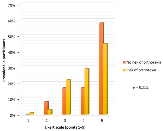 Figure 4 shows the self-assessed impact of celiac disease on participants’ diet using a five-point Likert scale according to orthorexia risk status. The percentage of subjects gradually increased as the impact of celiac disease on diet increased in both at-risk and non-at-risk celiac participants. Among those with no risk of orthorexia, as many as 75% rated the impact of celiac disease as 4–5 in the 5-point scale. Similar results were found in the group with risk of orthorexia, 74%. The results were not statistically significant (p = 0.352).