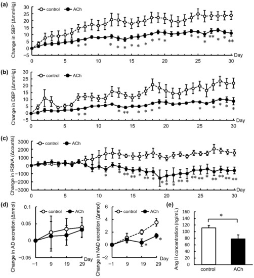 23]. It is thought that repeated oral ACh administration suppresses the renin–angiotensin system by decreasing SNA and catecholamine levels. The sympathetic nervous system and the renin–angiotensin system are enhanced in SHRs [