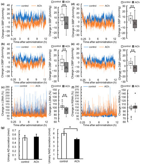 20]; therefore, RSNA did not decrease significantly in our study. Dysfunction of the baroreflex may be responsible for the specific antihypertensive effect of orally administered ACh under only hypertensive conditions. In a previous study, oral ACh administration had no effect on normotensive Wistar-Kyoto rats [