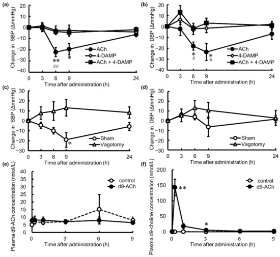 −8 mol/kg BW). The compounds were dissolved in pure water and administered using oral sonde at 9:00 h. In the ACh + 4-DAMP group, 4-DAMP was administered 10 min before ACh administration. SBP and DBP were measured before and at 3, 6, 9, and 24 h after administration by the tail-cuff method (Softron BP-98A, Softron Co., Tokyo, Japan) as previously reported [