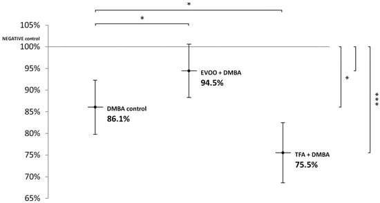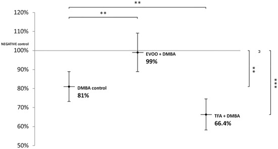 EVOO exerts antioxidant and anti-inflammatory effects directly on cell membranes, and through the regulation of secondary signal transporters [11,12,67], DMBA decreased significantly; additionally, combined DMBA + TFA-induced L1-RTP DNA hypomethylation was observed in the liver and spleen but not significantly in the kidneys of CBA/Ca mice. EVOO induces the PPARγ gene [106], and thereby, theoretically, it could decrease the mentioned synergic damage of DMBA combined with TFA.