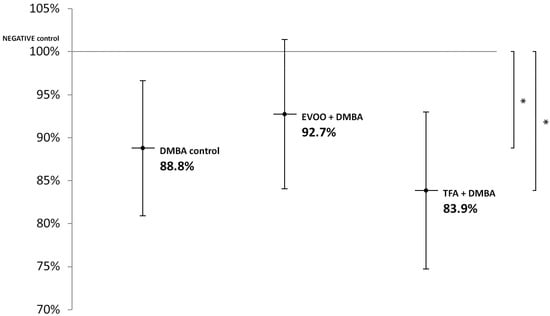 DMBA and DMBA + TFA-induced significant L1-RTP DNA hypomethylation in the liver, compared to the negative control. EVOO ameliorated the effect of DMBA (Figure 2).