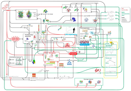 In summary, high EVOO intake with diet decreases the likelihood of cancer and increases life expectancy because EVOO can counteract DMBA and TFA-induced damage by improving global DNA methylation pattern, while decreasing hyperglycemia, mTOR activity, and inducing SIRT1 function among other [11,12,97,103,106,158] (Figure 4).