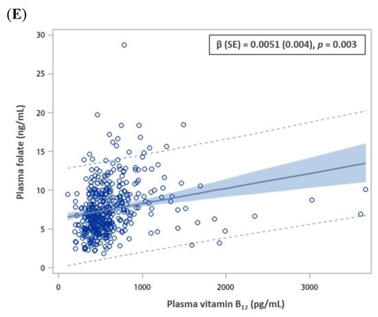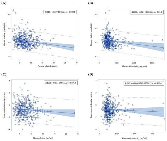 Notably, plasma homocysteine significantly decreased as plasma folate and vitamin B12 increased, with regression coefficients of −0.0197 (p-value = 0.0004) and −0.0012 (p-value = 0.014), respectively (Figure 1A,B). However, vitamin B12 and plasma folate and vitamin B12 were not related to BMD T-scores (Figure 1C,D).
