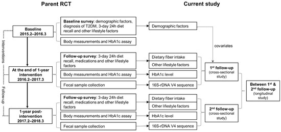 Longitudinal analyses were conducted by using dietary fiber intake over the 1-year observation as an exposure, while gut microbiota or HbA1c level at the second follow-up as the outcomes. Age, sex, educational level, duration of diabetes, intervention status in parent trial, physical activity level, total energy intake, use of anti-diabetes agents and NSAIDs within six months before stool collection were adjusted in all models as covariates. All statistical analyses were performed using R version 4.1.0. p-value < 0.05 was considered statistically significant.