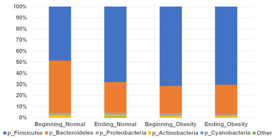Fecal samples were collected from women with normal weight and women with obesity at the beginning and end of the intervention, DNA was extracted, V3-16S rRNA gene libraries were prepared by PCR, and high-throughput sequenced, as described in the Materials and Methods section. A sequencing set of average 183 bases, with at least 9150 counts, with a Phred-like Quality Score of 31 was obtained for each woman (Table S1). At phyla level, the relative abundance of Bacteroidetes and Firmicutes were dominant in all groups; only the normal weight group at beginning of the intervention showed high values of relative abundance for Bacteroidetes, and less relative abundance of Firmicutes comparing with the rest of the groups; nevertheless, this difference is not statistically significant (Figure 1, Supplementary Materials Table S2). Alternatively, the relative abundance of phylum Firmicutes was at least 50% and the Bacteroidetes was at least 30% in all groups. The phyla Proteobacteria and Actinobacteria were at least 1.5% in all groups, and Cyanobacteria had the lowest relative abundance or was not detectable in the obesity group by the end of nopal diet intervention. No statistically significant changes at phyla level were observed with the nopal intervention, neither in the normal weight or the obesity group (Figure 1, Table S2).