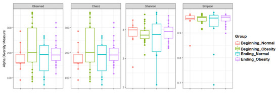 Alpha diversity of bacteria in fecal samples during nopal diet intervention. The figure shows data for normal weight and obesity groups at beginning and ending of nopal diet. The Y-axes indicate the values for the corresponding indexes: Observed number of species (Observed), expected bacterial richness (Chao1), and Shannon and Simpson diversity indexes. See Table S4.