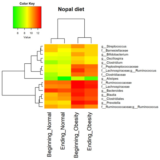 Bacteria with high relative abundance during nopal diet intervention. Differential abundance of the top 16 bacteria in fecal samples. The heat map shows differences among beginning and ending with nopal diet intervention on normal weight and obesity groups. Columns show the abundance of the top 16 bacterial taxa present in at least 95% of samples. Rows show the 16 bacteria clustered by its abundance in the group. The color key from green to red indicates differences in the natural logarithm of the absolute abundances obtained from the taxa-bar-plots.