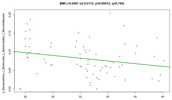 We determined a statistically significant association of members of the gut microbiota with the clinical metadata using MaAsLin analysis. The results showed negative association of BMI with the abundance of the family Barnesillaceae (p = 0.0112, q = 0.194) for the obesity (29–45) and normal weight groups (19–24) (Figure 5).