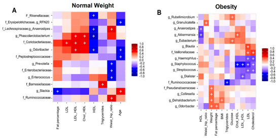 Spearman correlations of clinical metadata and bacterial abundance during nopal diet intervention. (A) Correlation in the normal weight group (B) Correlation in the obesity group. The heat map shows correlation between bacterial taxa and numerical metadata. Columns show the numerical metadata. Rows show the bacterial taxa. The color key from blue to red indicates the correlation value between −1 to +1; −1 indicates negative correlation and +1 positive correlation. The symbol “+” denotes a significance of p < 0.05.