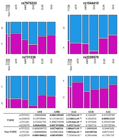 - Rasoul, M.A.; Haider, M.Z.; Al-Mahdi, M.; Al-Kandari, H.; Dhaunsi, G.S. Relationship of Four Vitamin D Receptor Gene Polymorphisms with Type 1 Diabetes Mellitus Susceptibility in Kuwaiti Children. BMC Pediatr. 2019, 19, 71. [Google Scholar] [CrossRef] [PubMed]