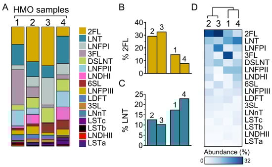 Composition of HMOs prepared from four individuals. (A) Percentage composition of HMOs extracted from four mothers (#1, 2, 3 and 4) determined by using HPAEC–PAD. (B–C) HMO composition of mothers #2 and #3 versus mothers #1 and #4 differ in the abundance of both LNT and 2′-FL. (D) HMO composition across four maternal donors clustered by STAMP using the unweighted pair group method with arithmetic mean. 2FL, 2′-fucosyllactose; 3FL, 3′-fucosyllactose; LDFT, lacto-difucotetraose; LNT, lacto-N-tetraose; LNnT, lacto-N-neotetraose; LNFPI, lacto-N-fucopentaose I; LNFPII, lacto-N-fucopentaose II; LNFPIII, lacto-N-fucopentaose III; LNDHI, lacto-N-difucohexaose I; LNDHII, lacto-N-difucohexaose II; 3SL, 3′-sialyllactose; 6SL, 6′-sialyllactose; LSTa, sialyl-lacto-N-tetraose a; LSTb, sialyl-lacto-N-tetraose b; LSTc, sialyl-lacto-N-neotetraose c; DSLNT, disialyl-lacto-N-tetraose.