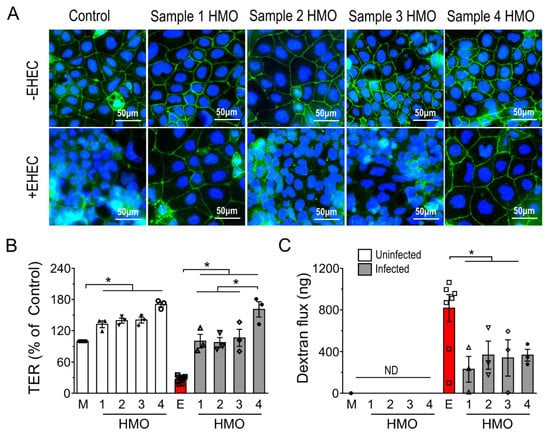 To validate these structural changes in intercellular tight junction morphology, the effects of HMOs on intestinal epithelial barrier function were tested by measuring both transepithelial electrical resistance (TER) and transcellular permeability using a 10 kDa fluorescein isothiocyanate-dextran probe []. In both the absence and presence of EHEC O157:H7, each of the HMO blends significantly increased Caco-2Bbe1 TER compared to the baseline levels, with HMOs prepared from individual #4 having the greatest effect (Figure 2B). As shown in Figure 2C, the dextran flux assay showed that EHEC-induced increases in macromolecule permeability were reduced in polarized epithelia pretreated with HMOs. Taken together, these results indicate that individual HMO blends share barrier-protective properties, regardless of composition, but vary in their ability to protect against bacterial pathogen-induced disruption in the localization of intercellular tight junction proteins.