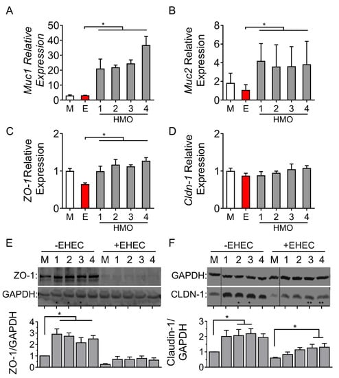 Effects of individual HMO blends on the expression of innate defense and intercellular tight junction proteins in Caco-2Bbe1 cells. Epithelial cells grown in 24-well plates were treated with each of the HMOs prepared from four individuals followed by EHEC O157:H7 challenge (4 h, MOI 100:1). mRNA was extracted to measure, using RT-PCR, levels of: (A) Muc1, (B) Muc2, (C) Zo-1 and (D) Cldn-1 (n = 3–4 per group). Western blotting shows protein levels of (E) ZO-1 and (F) Claudin-1 after 4 h of EHEC challenge with corresponding densitometry of immunoblots shown below each representative immunoblot (n = 4 per group). Densitometry ratios were measured using GAPDH as a loading control. The dotted line indicates spliced sites from a single original immunoblot. Values are expressed as means, ±SEM; * denotes p < 0.05 (ANOVA with Bonferroni post hoc analysis). M denotes medium; E denotes EHEC; numbers 1 through 4 denote HMO composition preparations from individuals 1 to 4.