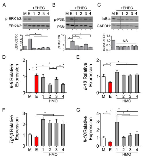 Effects of individual HMO blends on immune signaling and chemokine/cytokine expression in Caco-2Bbe1 cells. Epithelial cells grown in 24-well plates were pre-treated with each of the four HMO preparations followed by EHEC O157:H7 challenge (3 h, MOI 100:1) and then assessed for (A) phosphorylation of ERK1/2 (n = 4–5 per group), (B) phosphorylation of P38 MAP kinase (n = 4–5 per group) and (C) NF-κB activation (n = 4 per group). Densitometry ratios were measured using corresponding non-phosphorylated MAPK or GAPDH as loading controls. Dotted lines indicate spliced sites from a single, original Western blot. At 4 h post-EHEC challenge, mRNA was extracted to measure levels of (D) Il8, (E) Il18, (F) Tgfβ and (G) Il10 (n = 3–4 per group). Data are expressed as means, ±SEM; * denotes p < 0.05 (ANOVA with Bonferroni post hoc analysis). M denotes medium; E denotes EHEC; numbers 1 through 4 denote HMO composition preparations from individuals 1 to 4.