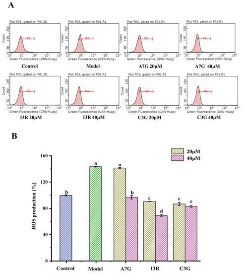Inhibitory effects of apigenin-7-O-glucoside (A7G), isorhamnetin-3-O-rutinoside (I3R), and cyanidin-3-O-glucoside (C3G) on AGEs-induced RAW264.7 cells cellular ROS. (A) Flow cytometer analysis. (B) Relative content of ROS among different groups. The values are presented as mean ± SD of three replicates. Different letters (a, b, c, d) indicate significant differences (p < 0.05).