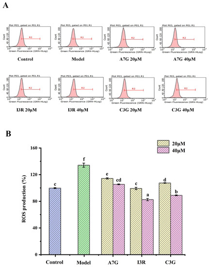 Effects of A7G, I3R, and C3G on AGEs-induced EA.hy926 cellular ROS inhibition of cells. (A) Flow cytometer analysis. (B) Relative content of ROS among different groups. Values are expressed as mean ± SD of three replicates. Different letters (a, b, c, d, e, f) indicate significant differences (p < 0.05).