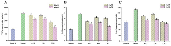Effects of A7G, I3R, and C3G on three pro-inflammatory cytokines, including TNF-α (A), IL-1β (B), and IL-6 (C) in RAW264.7 cells induced by AGEs. Different letters (a, b, c, d, e, f) indicate significant differences (p < 0.05).