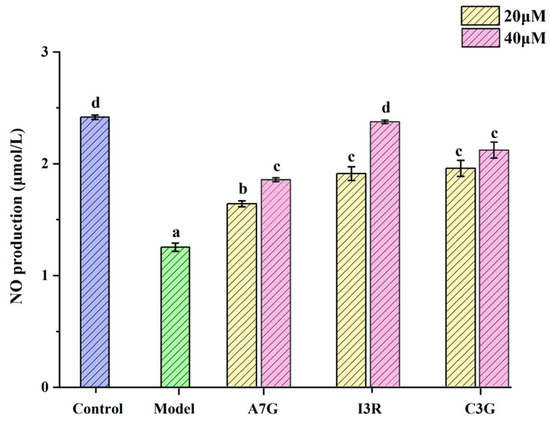 NO production by EA.hy926 cells by A7G, I3R, and C3G. Values are expressed as mean ± SD of three replicates. Different letters (a, b, c, d) indicate significant differences (p < 0.05).