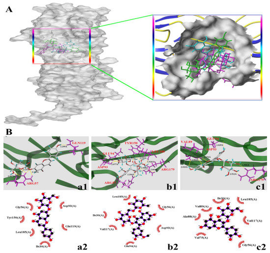 Molecular docking diagram of the compounds and the receptor of advanced glycation end products (RAGEs, PDB: 3CJJ). (A,B) in the figure represent the binding sites and binding conformations of small molecules in the RAGEs protein. The letters a, b, and c represent A7G, I3R, and C3G, respectively; a is green, b is purple, and c is cyan. Numbers 1–2 represent hydrogen bonding and hydrophobic interactions of small molecules and proteins, respectively.
