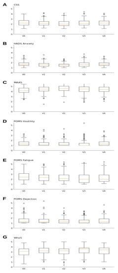 Box plots for questionnaires with p-values of 0.05 and below in the Friedman test: (A) CSS, (B) HADS, (C) MAAS, (D) POMS Hostility, (E) POMS Fatigue, (F) POMS Dejection and (G) WHO-5. Graphs present individual boxplots for each of the five visits (V0, V1, V2, V3, V4). Box boundaries represent 25% and 75% quantiles, the red line indicates the median, while the upper and lower whiskers show minimal and maximal values, except for outliers (“o”).